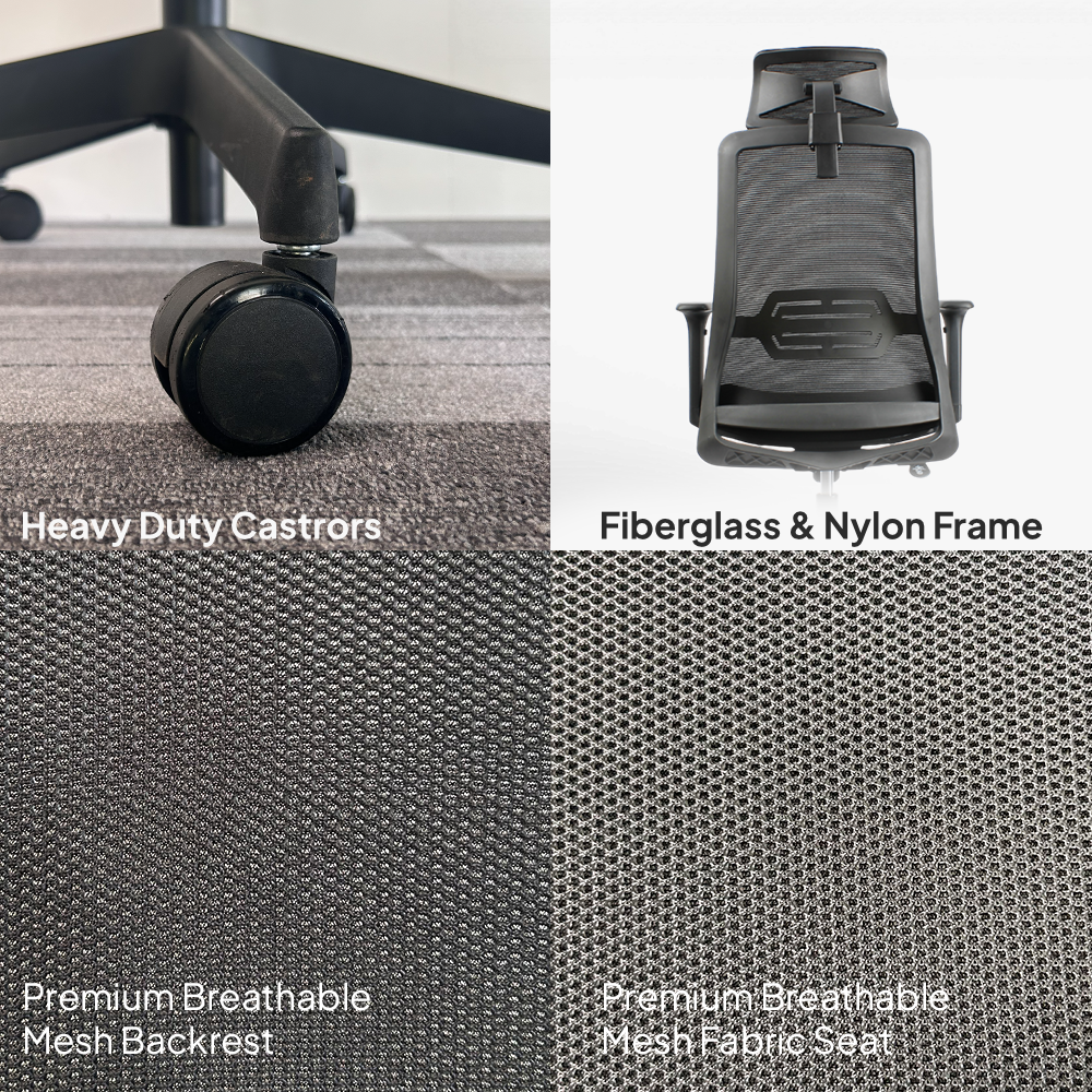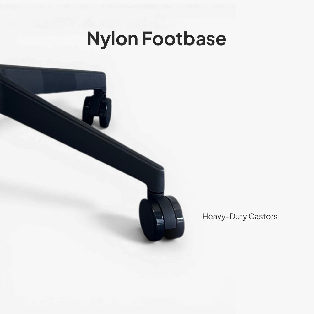 Rangka polypropylene yang tahan lama dan mesh backrest berkualitas tinggi untuk topangan dan sirkulasi udara yang lebih baik. Kursi ini menggunakan high-density foam yang dilapisi dengan mesh fabric yang sejuk untuk kenyamanan tahan lama, semuanya ditopang oleh nylon footbase dengan heavy-duty castors untuk mobilitas yang handal.